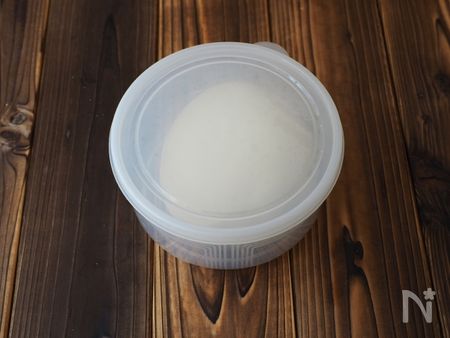9、生地を丸めなおし、大きめのタッパーなどに入れて、10~15分くらい休ませます。ぬれふきんをかけておいてもOK!