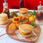 イングリッシュマフィンを半分に切り、下の方にソーセージパテ、チェダーチーズを乗せます。上の部分も一緒にオーブントースターに入れて、温めます。 チーズが溶けたら取り出し、重ねたら出来上がりです。 ハッシュドポテトと一緒に盛り付ければ、ママックの完成でせ。 |