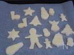 食パンを平なところにおき、お好きな型で抜きます。 抜いたら、溶かしバターをはけで表面に塗ります。 これを、クッキングシートを敷いた天板にのせ、上からもクッキングシートをのせてもう1枚天板をのせます。 |