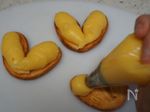 カスタードクリームを作る。 グループA 卵黄 1個、砂糖 30g、薄力粉 20g、牛乳 140cc の材料を大きめの耐熱容器に入れ、ホイッパーでよく混ぜる。電子レンジ(600w)で1分加熱し、取り出してよくかき混ぜます。次は、30秒加熱し、取り出してかき混ぜる。これを数回、丁度良い固さになるまで繰り返す。冷まして、絞り袋に入れておく。 |