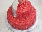 ❻を❺の上の方に飾る。 残った牛もも薄切り肉でもバラを作り、空いているところに飾る。 |