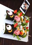 顔部分に、❹をのせる。 切り込みには、レタスを挟み、赤ウィンナー、竹輪くるくる巻き、❶、❸を挟んでいく。 |