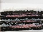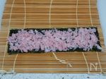 花弁を作る。 海苔を1/3に切ったものを5枚用意する。 巻き簀に海苔をのせて、ピンクの酢飯を50gのせ全体に広げる。 |