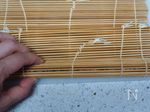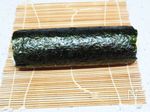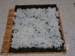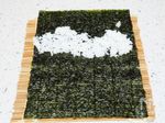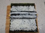 巻き簀の上に海苔を1枚と1/2枚を並べて置き、つなぎ目を2cm重ねる。まず、つなぎ目に、酢飯をのせてズレないようにする。 | |