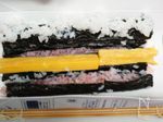 ラップで包み、少しおく。 海苔がなじんだら、8カットにする。 |