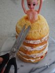 ❷〜❸を繰り返し、上まで積み重ねる。 真ん中の穴に人形を入れた時、スポンジがウエストまで高さになるようにする。 スカートの形になるように、スポンジの上の方をハサミでカットする。 |