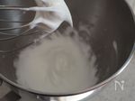 別のボウルに卵白を入れて泡だてる。 ある程度泡だったら、砂糖を2回に分けて加え更に泡だてる。 持ち上げた時に、鳥のくちばしのように垂れ下がるくらいまで。※立てすぎに注意。 |