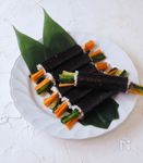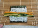 牛肉、人参、ほうれん草、たくわんを真ん中にのせて、巻き簀で巻く。 | |