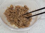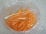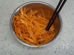 人参は千切りにし、耐熱ボウルに入れて、みりんを加えラップをして、レンジ(600w)で1分20秒ほど加熱する。 取り出して、水分を軽く切る。 |