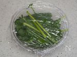 ほうれん草は、根を落として半分に切り、耐熱ボウルに入れてラップをし、レンジ(600w)で50秒ほど加熱する。 取り出して水にさらして冷やし、よく水気を絞る。 |