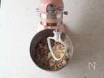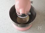 キッチンエイドのスタンドに1のステンレスボウルをセットし、グループA 鶏ガラスープの素・砂糖 小さじ1、塩 少々、醤油・ごま油・生姜汁 小さじ1 と2を入れる。羽根はビーターを取り付ける。 |