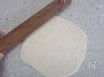 めん棒で生地を丸く伸ばす。外側は、なるべく薄くなるように伸ばす。 ※くっつくようなら打ち粉をしながら作業する。 |