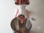 ・肉だねを作る。 キッチンエイドのスタンドに、フードグラインダー アタッチメント(ブレード大)を取り付ける。下には、付属のステンレスボウルをおく。速度4にして、3cm角に切った豚肩ロースかたまり肉を入れ、フードプッシャーで押し込んでいく。 |