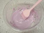 好みのチョコペンは、ハサミで切って中身をボウルに出し、50度の湯煎にかけて溶かす。 | |