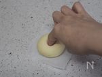 人差し指に強力粉を付けて、生地の真ん中に穴を開ける。 | |