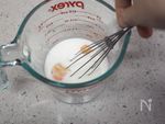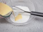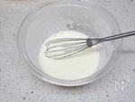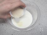 別の耐熱ボウルに、生クリームとインスタントゼラチン(クックゼラチン)を入れて混ぜる。 | |