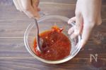B にんにく(すりおろし) 1/2片、コチュジャン 大さじ3、トマトケチャップ 大さじ2、しょうゆ、砂糖 各大さじ1、酢 小さじ2 の材料を合わせてヤンニョムだれにする。 |