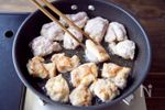 フライパンにサラダ油、鶏肉を皮目から入れてから、 強めの中火にかけ、動かさずに加熱する。 ふつふつとしてきたら5分程度揚げ焼きにし、上下を返してさらに3分加熱し、取り出す。(※油がはねるので注意してください) |