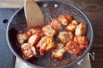 熱いのでやけどに気をつけてフライパンの油を拭き取る。 (※火から外して少しさましてから拭き取る方が安全です。) ヤンニョムだれをフライパンに入れ、弱めの中火にかけ、 全体がふつふつとしてきたらを加えて絡ませる。 鶏肉にたれがからまって水気がほぼなくなったら、盛り付ける。 お好みでレタスを添える。 |