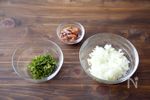 玉ねぎはみじん切り、青じそは千切りに、梅干しは手でちぎる。 | |