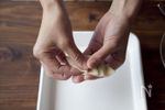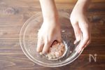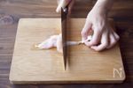 ささみは筋をとり、包丁で粗めにたたく。 ※ささみの筋の取り方はサイトに詳しくのせているので、 そちらも合わせてどうぞ。 http://www.futari-gohan.jp/ume-sasami-gyoza/ |