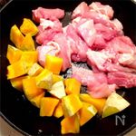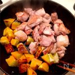 中火に熱したフライパンにオリーブオイルをひき、鶏肉とカボチャを広げて焼き付ける。焦げ目がつくまで触らずに焼く。 | |