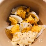 ゆで卵の殻をむき、粗めに割り、A マヨネーズ 大さじ3、米酢または黒酢 大さじ2、蜂蜜 大さじ1/2、塩こしょう 少々 と混ぜ合わせてドレッシングを作る。 |