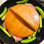 5分くらい焼いて鶏の油が出てきたら、脇にアスパラとスナックエンドウを置いてさらに3分ほど一緒に焼く。 | |