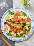 皮目がこんがりパリッと焼けたら裏返してアスパラとスナックエンドウを上にのせて、空いた所にサラダエビを置いて焼き、お皿にとる。 | |