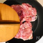 鶏モモ肉の余分な脂や筋をキッチンバサミで取り除き、下味B 砂糖、塩 ひとふり をふり、フライパンに皮目を下にして並べて弱めの中火にかける。上から落し蓋などで押しながら焼きます。 |