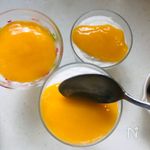 冷え固まったパンナコッタの上にマンゴーソースをのせ、食べる前にタピオカをのせて出来上がり。 | |
