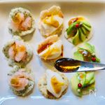 薄焼き煎餅の上にアボカド、甘エビ、絹ごし豆腐をのせ、固まった醤油ジュレを少量かけ、柚子の皮、カラフルペパー、柚子胡椒を飾る。 | |