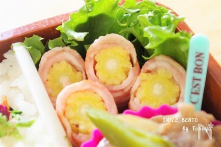 実際にポイントをおさえて15分で作ったお弁当がこちら。ヤングコーンのベーコン巻きに使ったヤングコーンの端を切るとお花の形に。ほかのおかずにトッピングすれば華やかに仕上がります。ごはんの仕切りにはワックスペーパーを使い、シリコンカップやピックを活用しています。