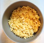 その上に残りのごはん250gを敷き、お皿をかぶせてひっくり返す。 | |