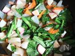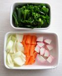 たまねぎは2cm四方くらいに、にんじんは1cm幅の短冊切りに、菜の花は3cmのざく切りにする。 まめかま(赤)は3mm厚にしたのを半分に切る。 |