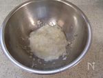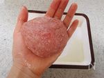 うっすら白っぽくなったら4等分にし、手に油をつけてキャッチボールをして空気をぬく。 | |