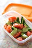 ・きゅうりはヘタを落とし、塩をつけてまな板の上で転がして板ずりをし、さっと水で洗って乱切りにする。 ・トマトは小さめのひと口大に切る。 |