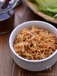 【だしがらと切り干し大根のナムル】 切り干し大根(40g)はたっぷりの水でほぐすように洗い、水気を軽く切る。 キッチンバサミで切り、だしがら、酢(大さじ1・1/2)、しょうゆ(大さじ1)、ごま油(大さじ1/2)で和え、切り干し大根が戻ったら出来上がり。 |