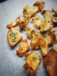 クルトンを先に作る(クルトンを焼いている間に野菜の下ごしらえをすれば、手順よく出来上がる)。A みじん切りニンニク 1片、オリーブオイル 大匙2~3、塩 ひとつまみ、パルミジャーノ 大さじ2~3、パセリみじん切り 適量 の材料をすべてフライパンに入れて火をかける。このあとでオーブンに入れるので、ここでは材料がまとまるくらいの火入れにしておかないと焦げる。火を消したらちぎったバゲットを入れて味をからませる。まんべんなくオイルがまわっていないようだったらオイルを足して、190度のオーブンで10分焼く。焼き上がりの色が薄くても余熱でカリカリになるのでもう火を入れない。オーブンの中で保温しておくとよい。 |