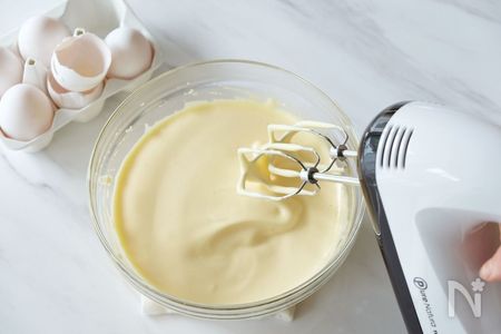 2.卵が人肌に温まり砂糖が溶けたら湯煎から外し、全体が白くもったりとしリボン状に落ちるくらいまでハンドミキサーなどで混ぜます。