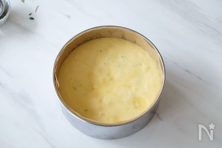 3.2にふるった薄力粉とタイム、レモンの皮を入れゴムベラで切るように粉気がなくなるまで混ぜます。