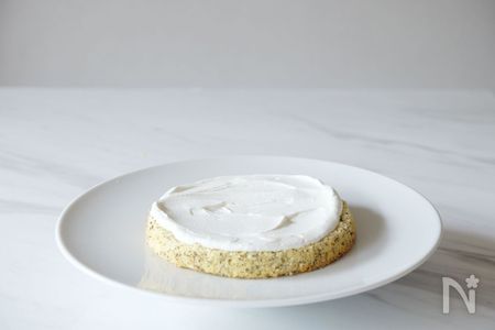 2.4枚重ねたら、一番上の部分にクリームを乗せて表面をキレイにします。キレイにしようと思わず、ラフに仕上げるイメージで、ムラがあっても気にしなくて大丈夫です。側面はあえてスポンジが透けるようにクリームを塗ります。