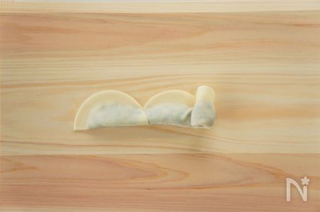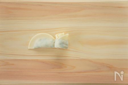 ④ 餃子の皮の縁に水をぬり、半分に折りたたんで空気が入らないようにあんを包む。