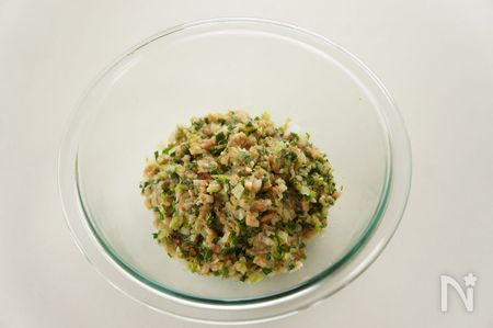 ② ボウルに豚ひき肉と塩少々を加えて、粘りが出るまで混ぜる。材料Aの調味料を加えて混ぜ、①の白菜、にら、しいたけ、白ねぎ、しょうがも加えて混ぜ合わせる。