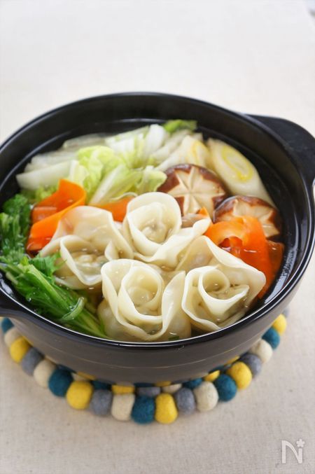 焼き餃子はもちろんですが、焼かずにお鍋に入れていただくのもおいしいですよ! いつもの鍋が華やかになって、鍋パーティーにもおすすめです。
