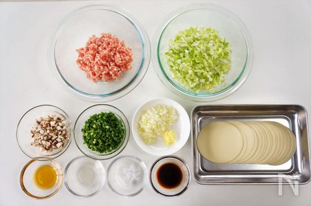 ① 白菜はみじん切りにして、塩小さじ1/4を加えて混ぜ10分ほどおき、水気をよくしぼっておく。にら、しいたけは細かく刻み、白ねぎはみじん切りにする。しょうがはすりおろす。