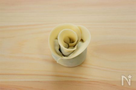 ⑥ 最後まで巻き終わったら、平らな面を下にして置き、花びらの部分を形よく整える。同様にして10個作る。