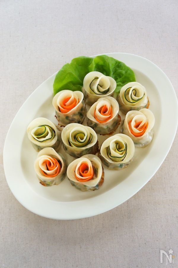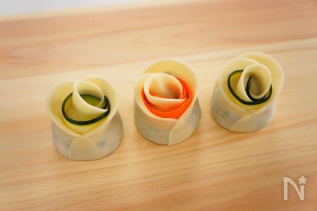 ピーラーでリボン状にむいたにんじんやズッキーニを一緒に巻くと更にかわいく仕上がります! 作り方は、ふつうの薔薇餃子の作り方④の後にピーラーでリボン状にむいた野菜をのせて一緒に巻きこむだけです。