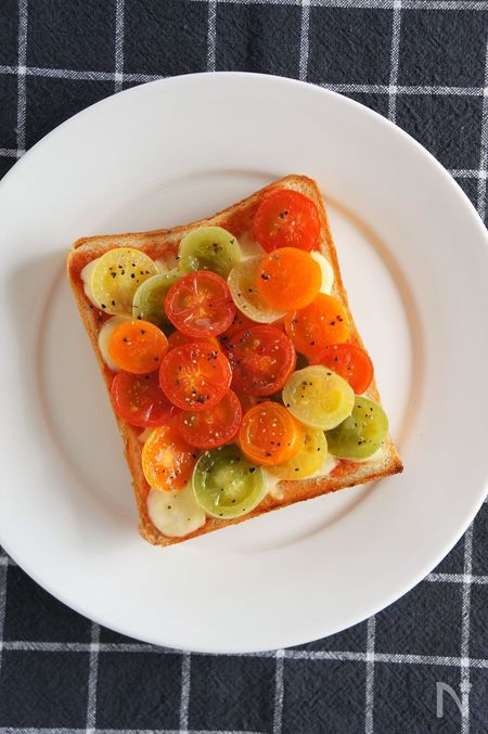 こちらは、食パンにケチャップをぬってピザチーズを散らし、輪切りにしたミニトマトを並べてトースターで香ばしく焼くだけのトマトづくしのトーストです。仕上げのブラックペッパーがアクセントに。