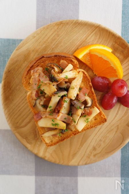 定番きのこのバター醤油ソテーをトーストにのせていただきます。ソテーにしっかり味がついているので、食パンには何もつけずに焼くだけでOK。サクッとした食パンときのこの食感が楽しいトーストです。
